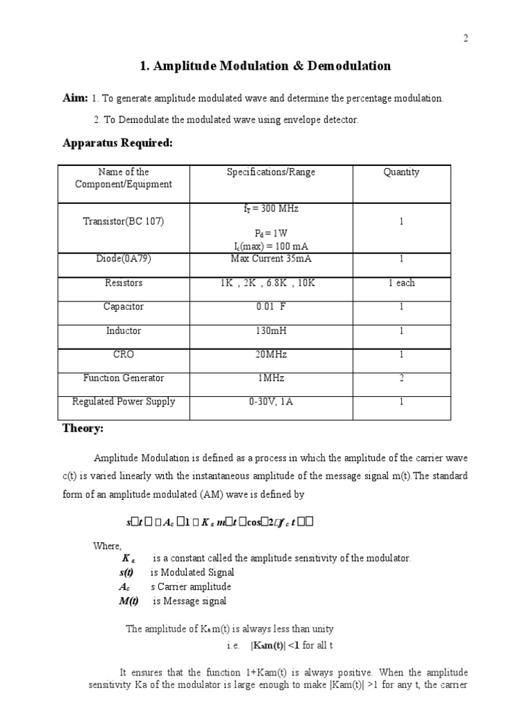 Aim: 1. To generate amplitude modulated wave and determine the percentage modulation.