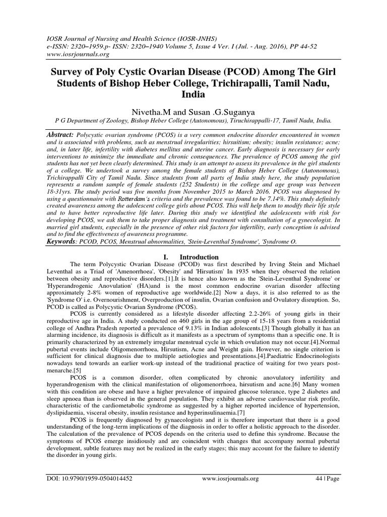 Survey of Poly Cystic Ovarian Disease (Pcod) Among The Girl Students of Bishop Heber College,..