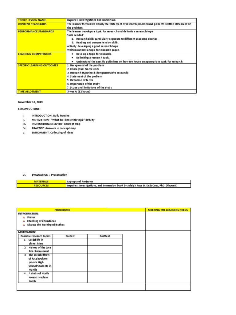 TOPIC/ LESSON NAME Inquiries, Investigations and Immersion