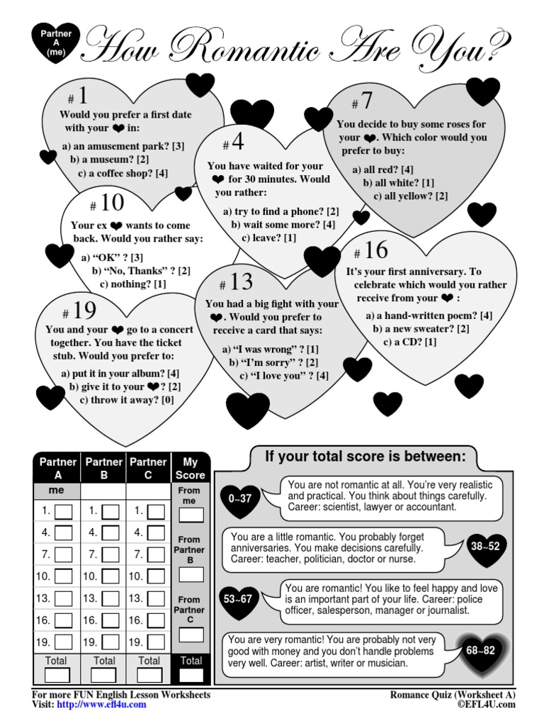 For more FUN English Lesson Worksheets Romance Quiz (Worksheet A)