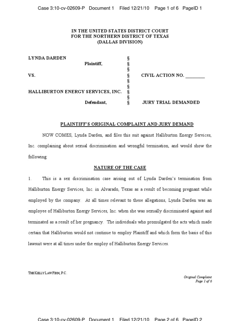 Lynda Darden is suing Halliburton energy services, Inc. For sex discrimination and wrongful termination. Darden was terminated in 2009 for violating the company's policy against procreation. Defendants were at all times under the employ of Halliburton Energy Services.