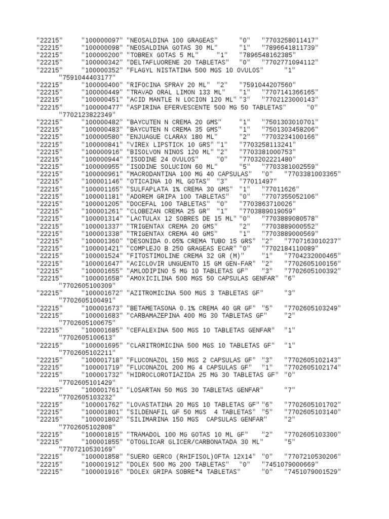 "22215" "100001658" "AMOXICILINA 500 MGS 50 CAPSULAS GENFAR" "6"