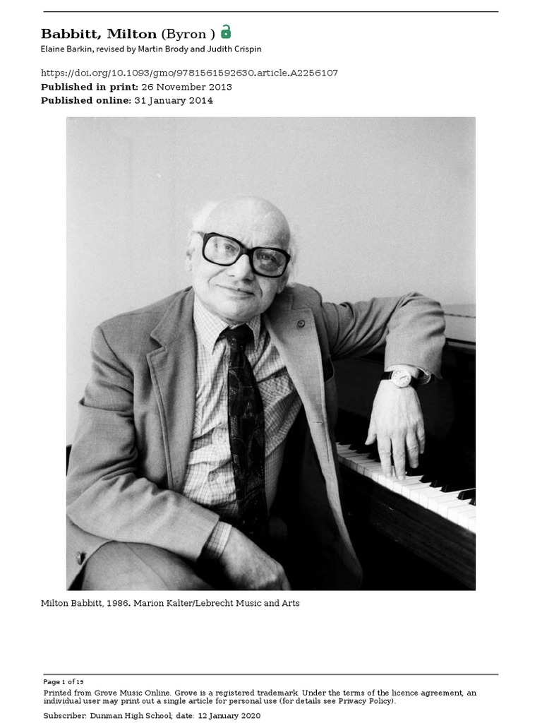 F.J. Oteri: “Milton Babbitt: a Discussion in 12 Parts,” NewMusicBox (1 Dec 2001) <http://