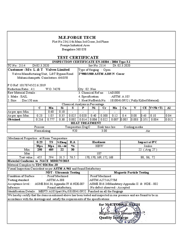 INSPECTION CERTIFICATE EN-10204 : 2004 Type 3.1