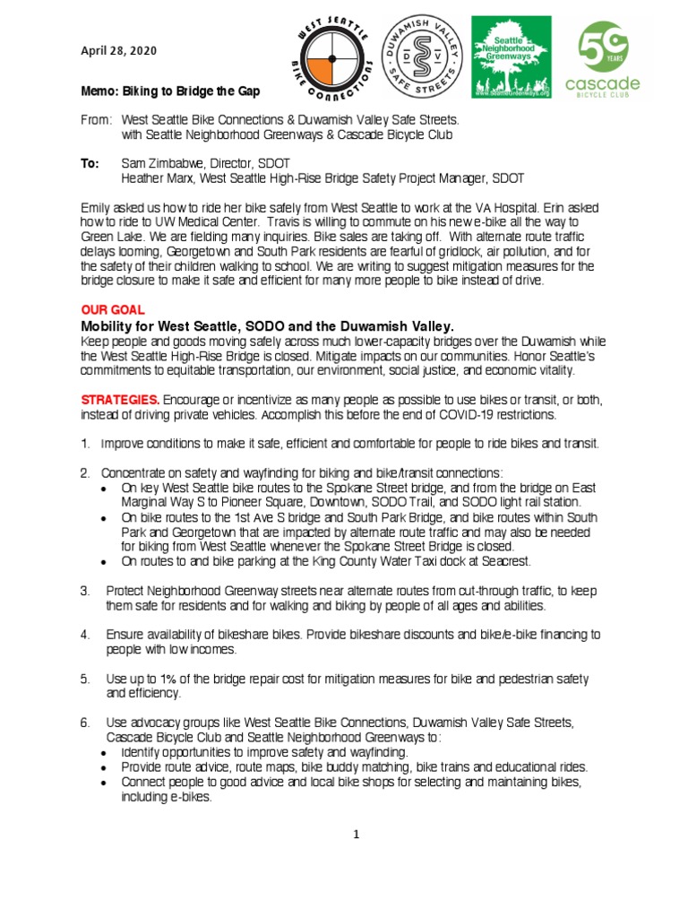 Emily asked us how to ride her bike safely from West Seattle to work at the VA Hospital. Erin asked how to ride to UW Medical Center. Travis is willing to commute on his new e-bike all the way to Green Lake. We are fielding many inquiries. Bike sales are taking off. With alternate route traffic delays looming, Georgetown and South Park residents are fearful of gridlock, air pollution, and for the safety of their children walking to school. We are writing to suggest mitigation measures for the bridge closure to make it safe and efficient for many more people to bike instead of drive.