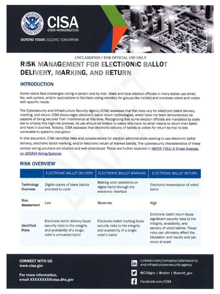 Ley rena an Ta) UNCLASSIFIED // FOR OFFICIAL USE ONLY RISK VIANAGEMENT FOR ELECTRONIC BALLOT DELIVERY, MARKING, AND RETURN INTRODUCTION ‘Some voters face challenges voting in-person and by mail, State and local election officials in many states use email, fax, web portals, and/or applications to facilitate voting remotely for groups like military and overseas voters and voters with specific needs. The Cybersecurity and Infrastructure Security Agency (CISA) assesses that the risks vary for electronic ballot delivery, marking, and retum. CISA discourages electronic ballot return technologies, which have not been demonstrated as capable of being secured from interference at this time, Recognizing that some election officials are mandated by state law to employ this high-risk process, its use should be limited to voters who have no other means to return their ballot and have it counted. Notably, CISA assesses that electronic delivery of ballots to voters for return by mail is less vulnerable to systemic disruption In this document, CISA identifies risks and considerations for election administrators seeking to use electronic ballot delivery, electronic ballot marking, and/or electronic return of marked ballots. The cybersecurity characteristics of these remote voting solutions are studied and well-understood. These are further explored in NISTIR 7551: A Threat Analysis ‘on UOCAVA Voting Systems RISK OVERVIEW (al Beene tren cents Baneeeteancan Eten Making voter selections on Technology _Digltal copies of blank ballots Electronic transmission of voted Overview provided to voter eee eS ballot electronic interface Risk ment LO Moderate High Electronic ballot return faces Electronic ballot delivery faces security risks to the integrity and availabilty of a single voter's unmarked ballot CT aL} Sno For more information, Cbs neunchin RES Electronic ballot marking faces security risks to the integrity and availabilty of a single voter's ballot firey significant security isks to the integrity, availabilty, and secrecy of voted ballots. These risks can ultimately affect the tabulation and results and can ‘occur at scale enn Pen Statice?PIS Ula see eee ogy eRe aa AULD CAPD aii All states use electronic ballot delivery, to transmit a digital copy of an unmarked ballot to the intended voter to mark, in compliance with the Military and Overseas Voters Empowerment Act (MOVE). These ballot delivery systems are exposed to typical information security risks of internet-connected systems. The most severe risks to electronic ballot delivery systems are those which would impact the integrity and/or the availabilty ofthe ballots, such as altering or removing ballot choices. These risks can be reduced and managed through use of appropriate security controls. Additionally, some electronic ballot delivery systems perform functions to verify a voter's identity before presenting them the ballot ‘tat is assigned to them. The identification process can utilize personal identifying information, such as name and driver's license number or biometrics. When this verification is improperly configured, remote electronic ballot delivery ‘systems can present additional privacy risks— lke the loss of theft of the voter's personal and/or biometric Identity Information. These tisks may be managed through configuration management and use of appropriate security controls. Electronic ballot marking allows voters to mark their ballots outside of a voting center or polling place. Typically, this describes the electronic marking of a digital copy of the blank ballot using the electronic interface, The marked ballot is then able to be returned to the appropriate official. For electronic ballot marking, the security of the marking device is @ consideration. Risks to electronic ballot marking are aga ra best managed through the Droduction of an auditable ‘Some risks of electronic ballot return have a physical analogue to the mailing of ballots. record, meaning the voted However, electronic systems provide far greater risk to impact a significant number of ballot is printed and verified by | allots in seconds the voter before being routed ‘© Scale: While mailing of ballots could be vulnerable to localized exoloitation, electronic retum of ballots could be manipulated at scale. For malled ballots, an adversary could theoretically gain physical access to a mailed ballot, change the contents, and reinsert it into the mail. This physical man-in-the-middle (MITM) attack is limited to low-volume attacks and mitigated by proper chain of custody to the appropriate official. This auditable record is an important compensating control for detecting a compromise of security in remote voting. by election officials. In comparison, an electronic MITM attack could be Conducted from anywhere in world, at high volumes, and could compromise Seeivene Sectronie ballet ballot confidentiality, ballot integrity, or stop ballot availability return as high risk. Electronic ballot return, the digital return of a voted ballot by the voter, creates significant security risks to voted ballot integrity, voter privacy, ballot secrecy, ‘and system availability ‘© Bring Your Own Device: Unlike traditional voting systems, electronic ballot delivery and return systems require a voter to use their own personal devices such as a cell phone, computer, or tablet to access the ballot. A voter's personal device may not have the necessary safeguards in place. AS a result, votes cast through “bring your own device” voting systems may appear intact upon submission despite tampering as a result of an attack on the personal device rather than on the ballot submission application itself. Voters using personal ‘Securing the return of voted devices increases the potential for an electronic ballot delivery and return ballots via the internet while system to be exposed to security threats, ensuring ballot integrity and Voter Privacy: Electronic ballot retum brings