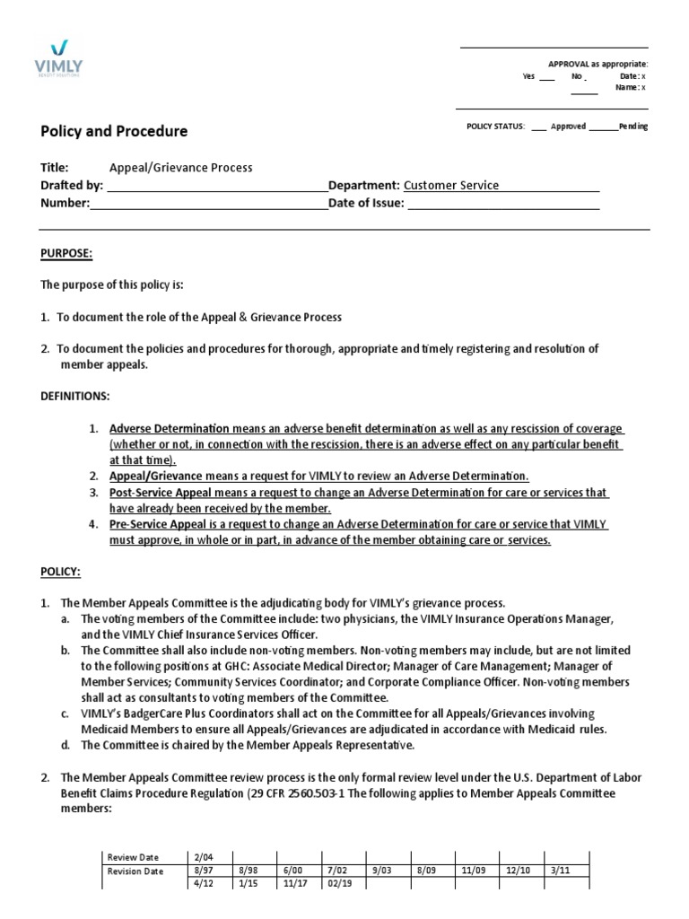 appeal in person. VIMLY will consider any written expression of dissatisfaction as an appeal with the potential to go