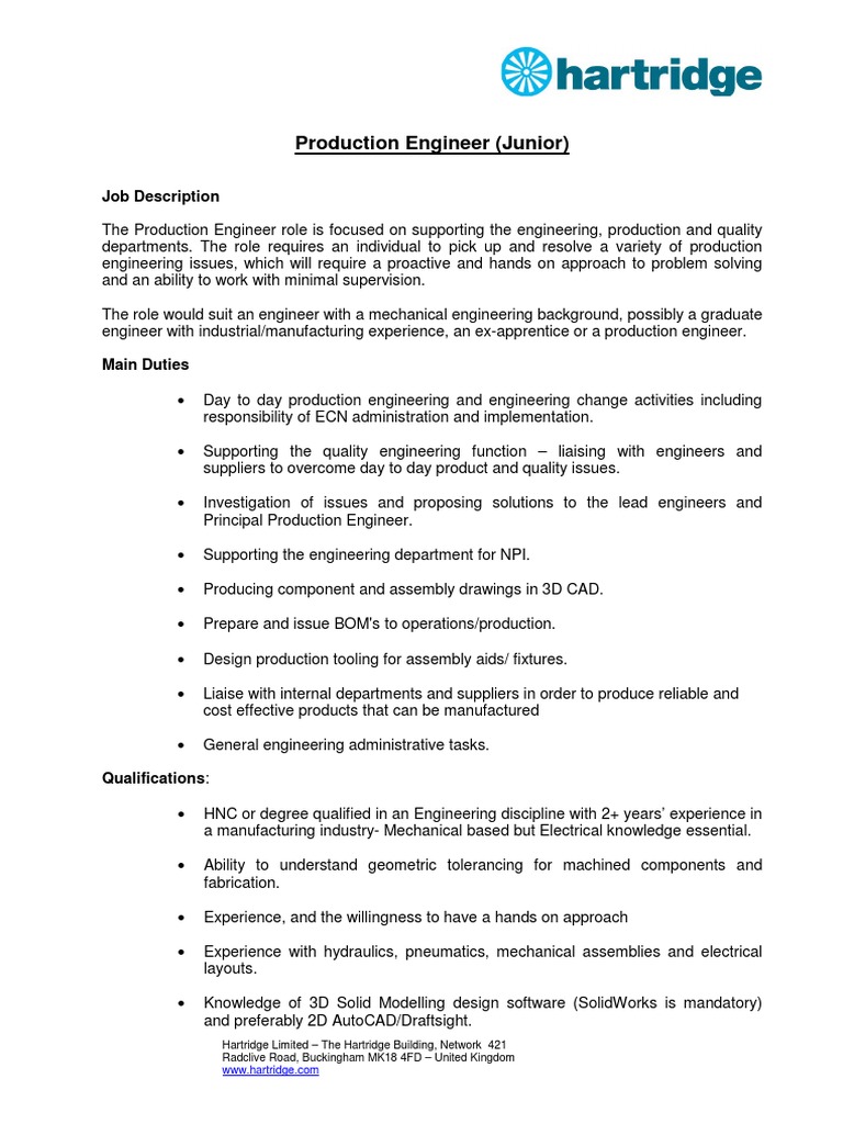 The Production Engineer role is focused on supporting the engineering, production and quality