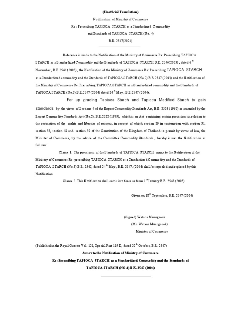 as a Standardized commodity and the Standards of TAPIOCA STARCH (No.2) B.E.2547 (2003) and the Notification of