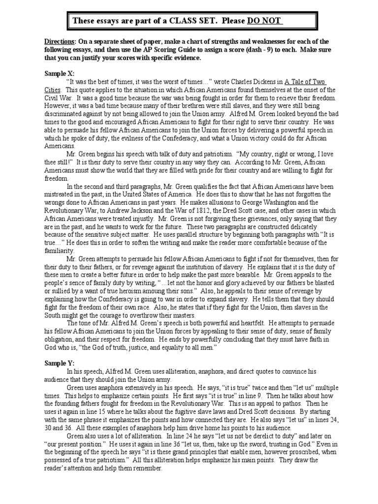 following essays, and then use the AP Scoring Guide to assign a score (dash - 9) to each. Make sure