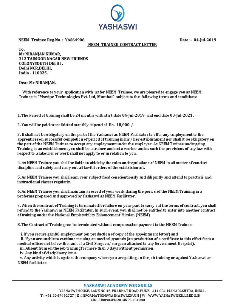 NEEM TRAINEE CONTRACT LETTER