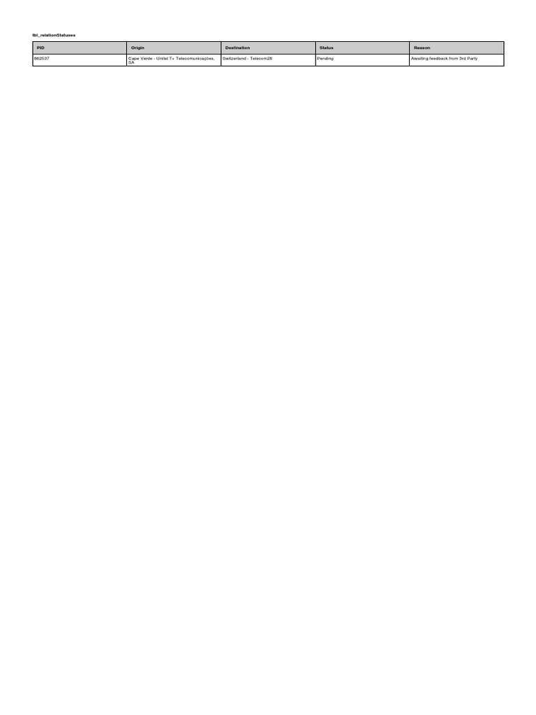 This document contains status information for a telecommunications connection between Cape Verde and Switzerland. The connection from Cape Verde carrier Unitel T+ Telecomunicações to Swiss carrier Telecom26 has a status of "Pending" and is awaiting feedback from a third party.