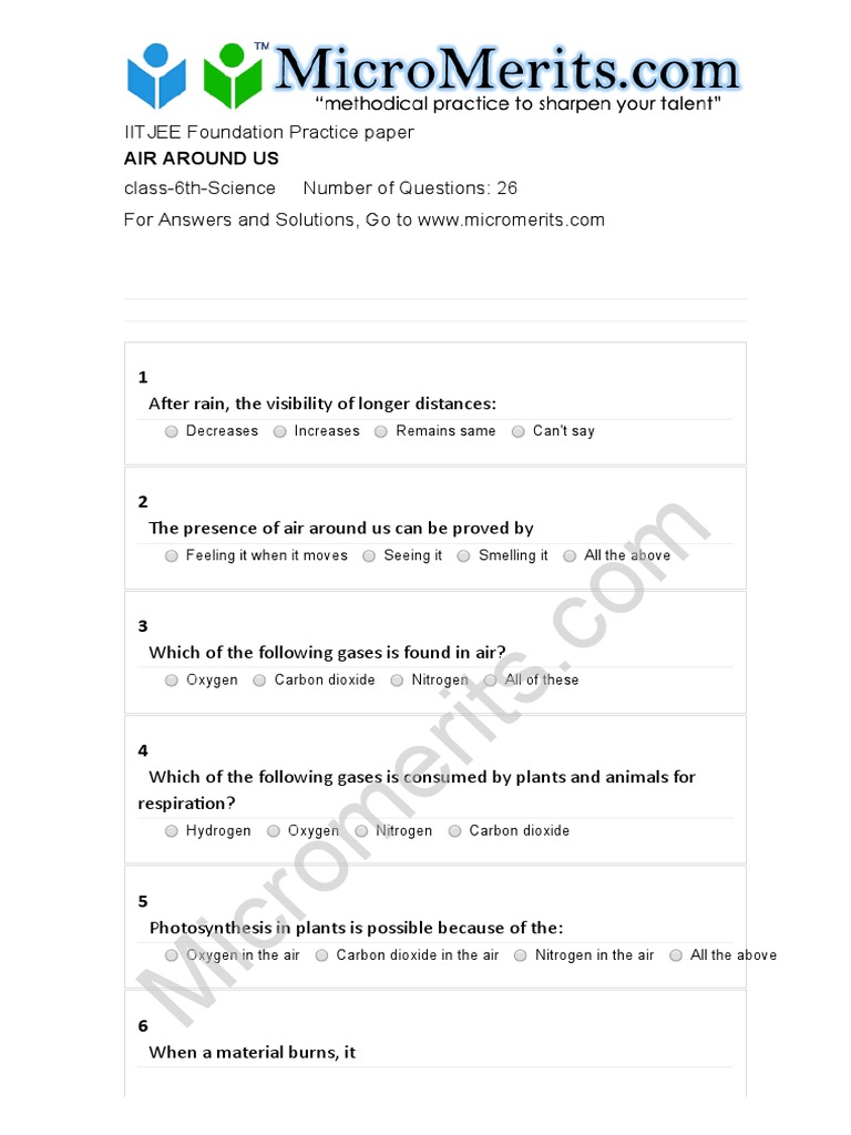 Class 6 Science Air Practice Test