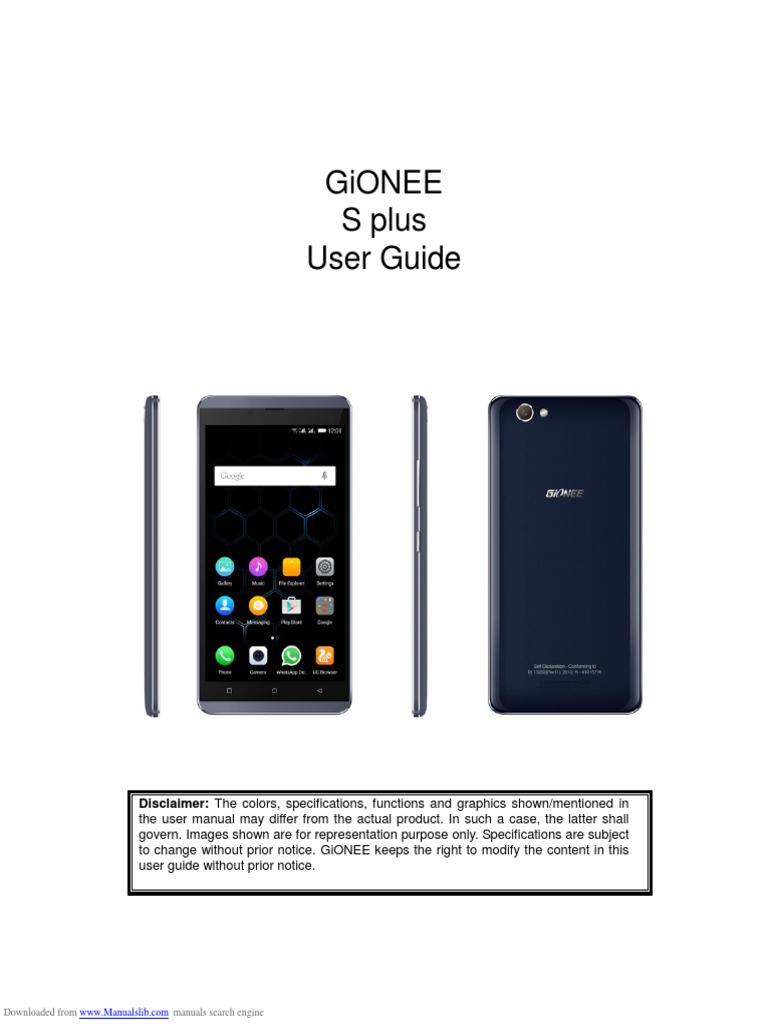 Gionee S Plus User Guide: Disclaimer: The Colors, Specifications, Functions and Graphics Shown/mentioned in