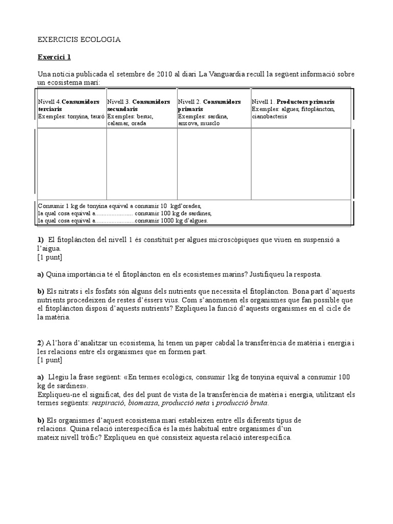 text anterior. Ordeneu les dades de la taula segons el nivell tròfic de cada espècie.