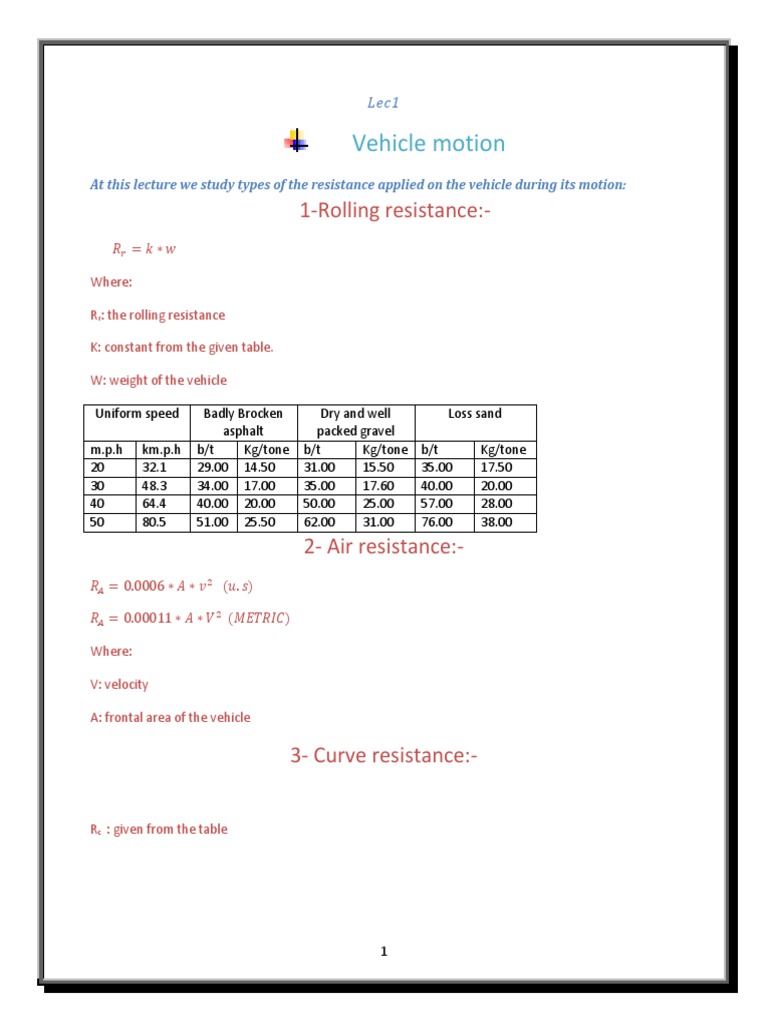 At this lecture we study types of the resistance applied on the vehicle during its motion: