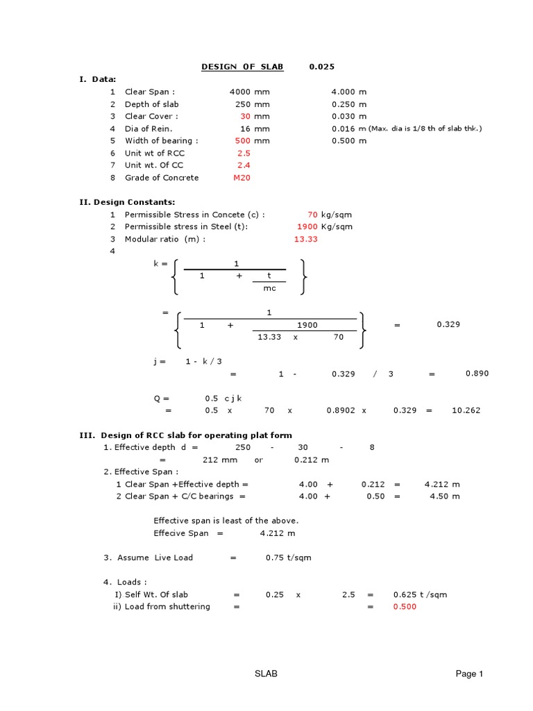 III. Design of RCC slab for operating plat form