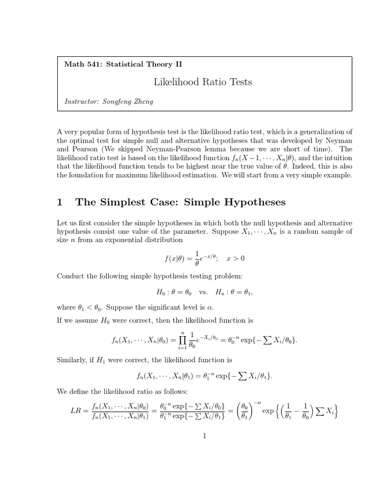 likelihood ratio test is based on the likelihood function fn (X −1, · · · , Xn |θ), and the intuition
