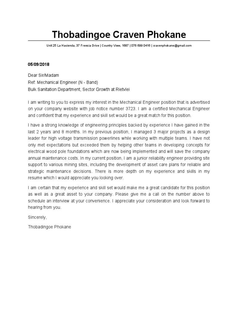 I am writing to you to express my interest in the Mechanical Engineer position that is advertised