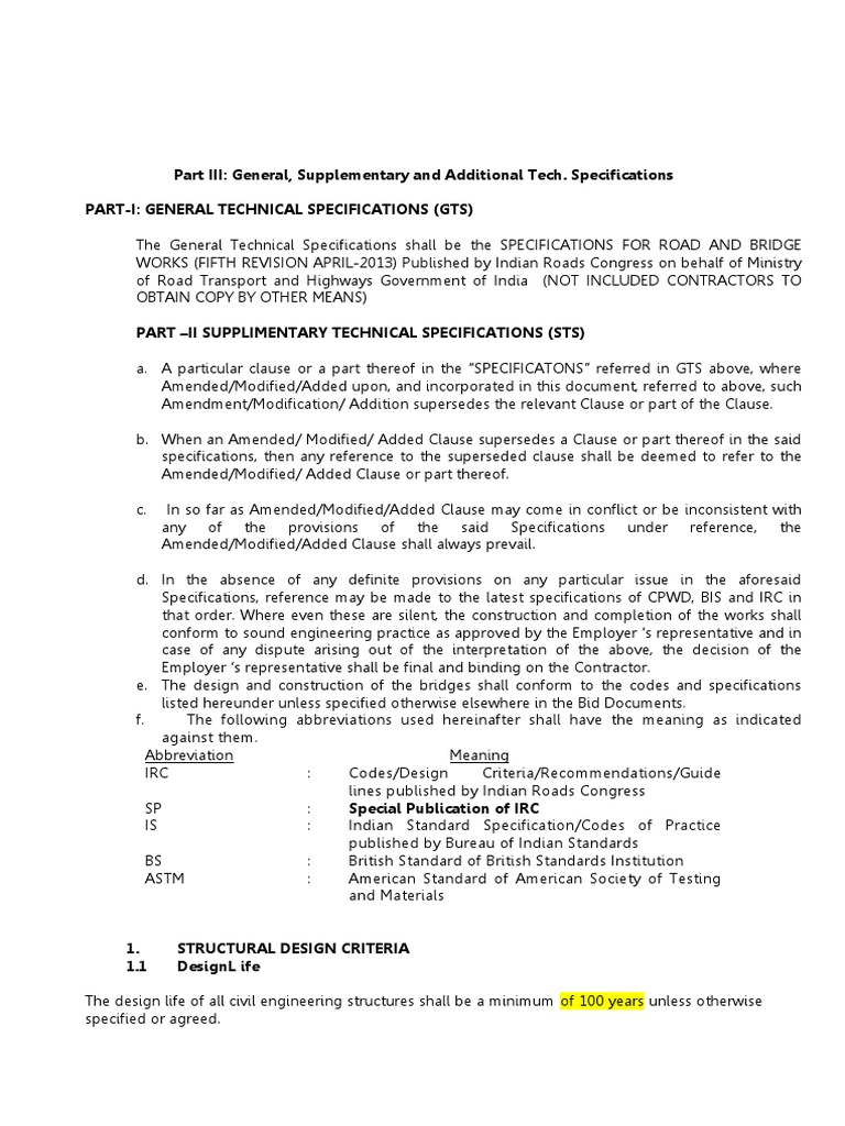 The General Technical Specifications shall be the SPECIFICATIONS FOR ROAD AND BRIDGE
