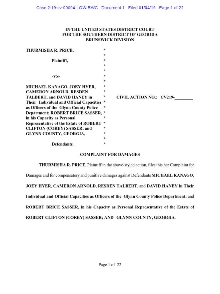 IN THE UNITED STATES DISTRICT COURTFOR THE SOUTHERN DISTRICT OF GEORGIABRUNSWICK DIVISIONTHURMISHA R. PRICE,**Plaintiff,***-VS-**MICHAEL KANAGO, JOEY HYER,*CAMERON ARNOLD, RESDEN* TALBERT, and DAVID HANEY in*CIVIL ACTION NO.: CV219- TheirIndividual and Official Capacities*as Officers of the Glynn County Police *Department; ROBERT BRICE SASSER,*in his Capacity as Personal *Representative of the Estate of ROBERT*CLIFTON (COREY) SASSER; and*GLYNN COUNTY, GEORGIA,**Defendants.*COMPLAINT FOR DAMAGESTHURMISHA R. PRICE