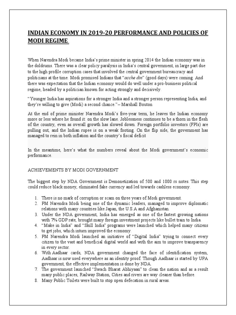 INDIAN ECONOMY IN 2019-20 PERFORMANCE AND POLICIES OF
