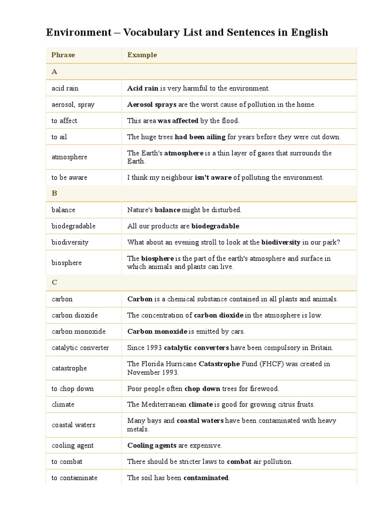 Environment – Vocabulary List and Sentences in English