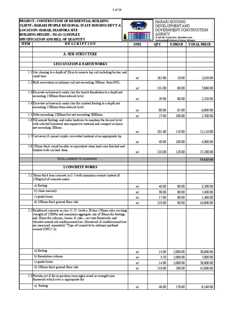 SPECIFICATION AND BILL OF QUANTITY harhousdev@[Link] Harar, Ethiopia