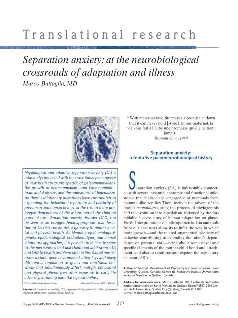 Neurobiology of separation anxiety - Battaglia Dialogues in Clinical Neuroscience - Vol 17 . No. 3 . 2015