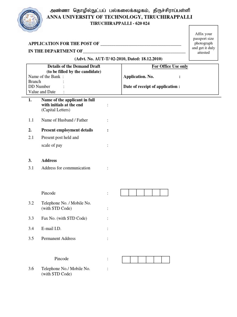 APPLICATION FOR THE POST OF _____________________________________ photograph