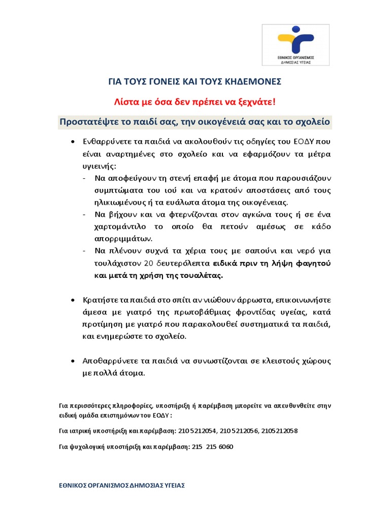 • Ενθαρρύνετε τα παιδιά να ακολουθούν τις οδηγίες του ΕΟΔΥ που