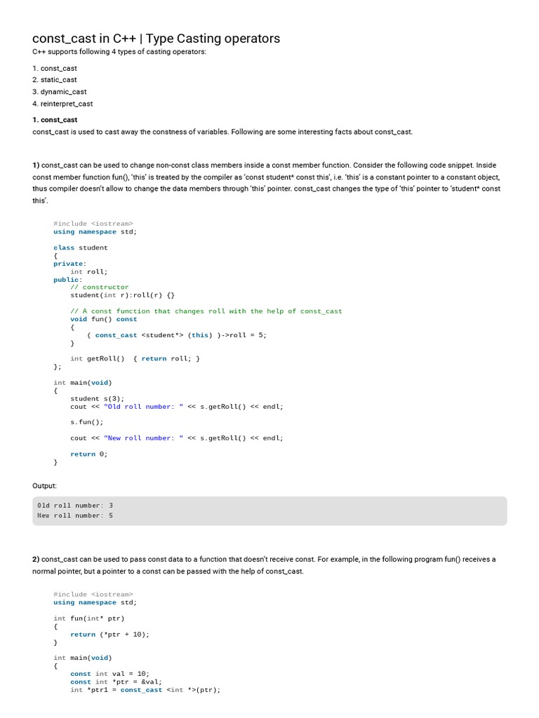 const_cast is used to cast away the constness of variables. Following are some interesting facts about const_cast.