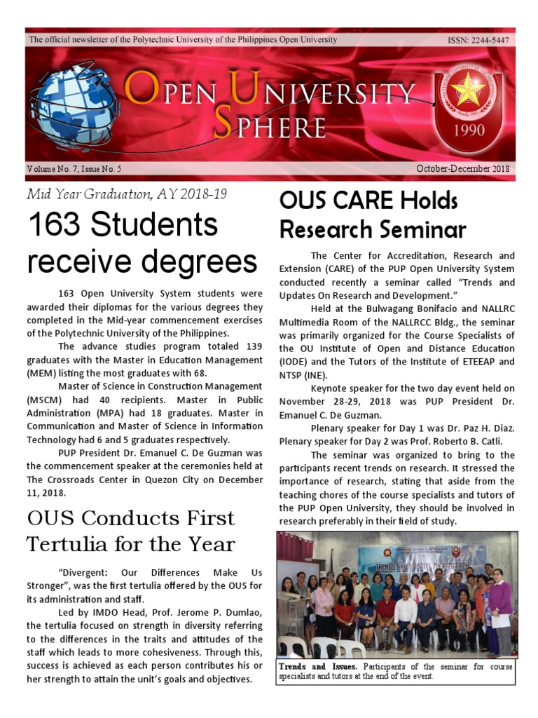 Vol. 7, No. 5 The official newsletter of the Polytechnic University of the Philippines Open University System October to December 2018