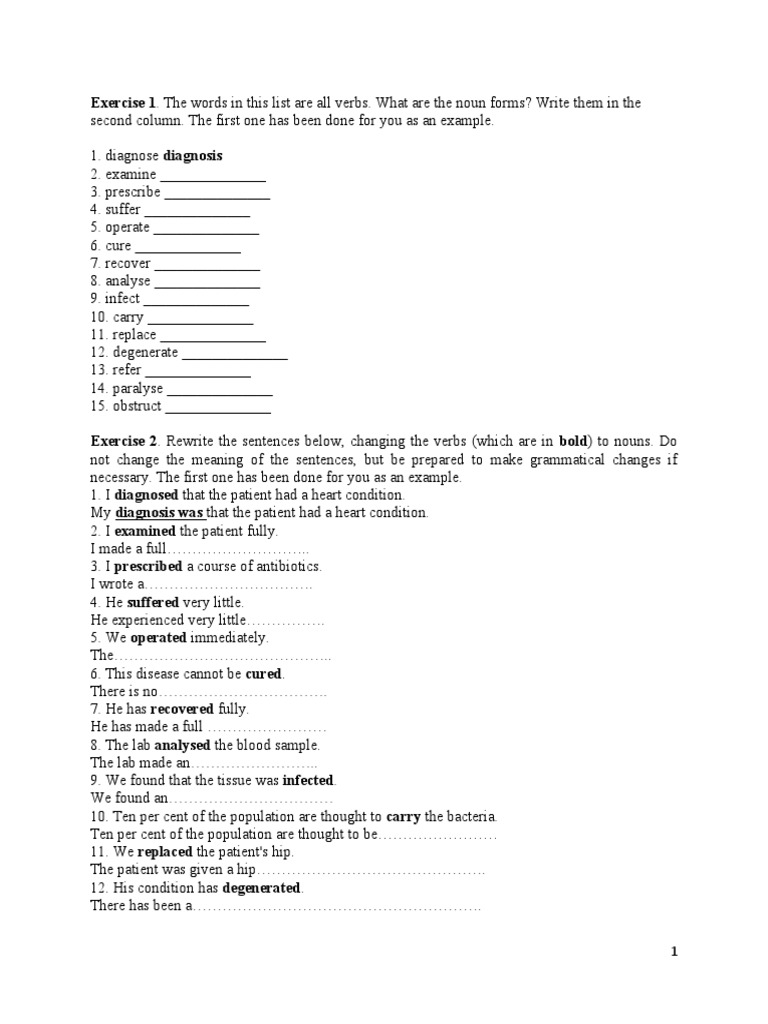 Exercise 2. Rewrite the sentences below, changing the verbs (which are in bold) to nouns. Do