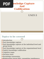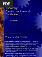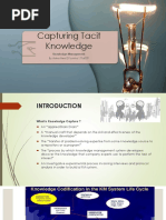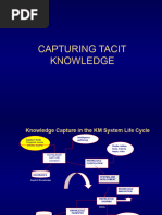 This document discusses methods for capturing tacit knowledge within an organization. It explains that tacit knowledge capture is important to avoid knowledge leakage and make best use of expertise. There are three phases to tacit knowledge capture: identification of knowledge to be captured, conceptualization through modeling, and codification to organize and externalize knowledge. Some methods used to capture tacit knowledge include collecting stories from experts, conducting interviews, observing how experts solve problems, and having experts describe best practices. Capturing tacit knowledge is particularly important for the service sector.