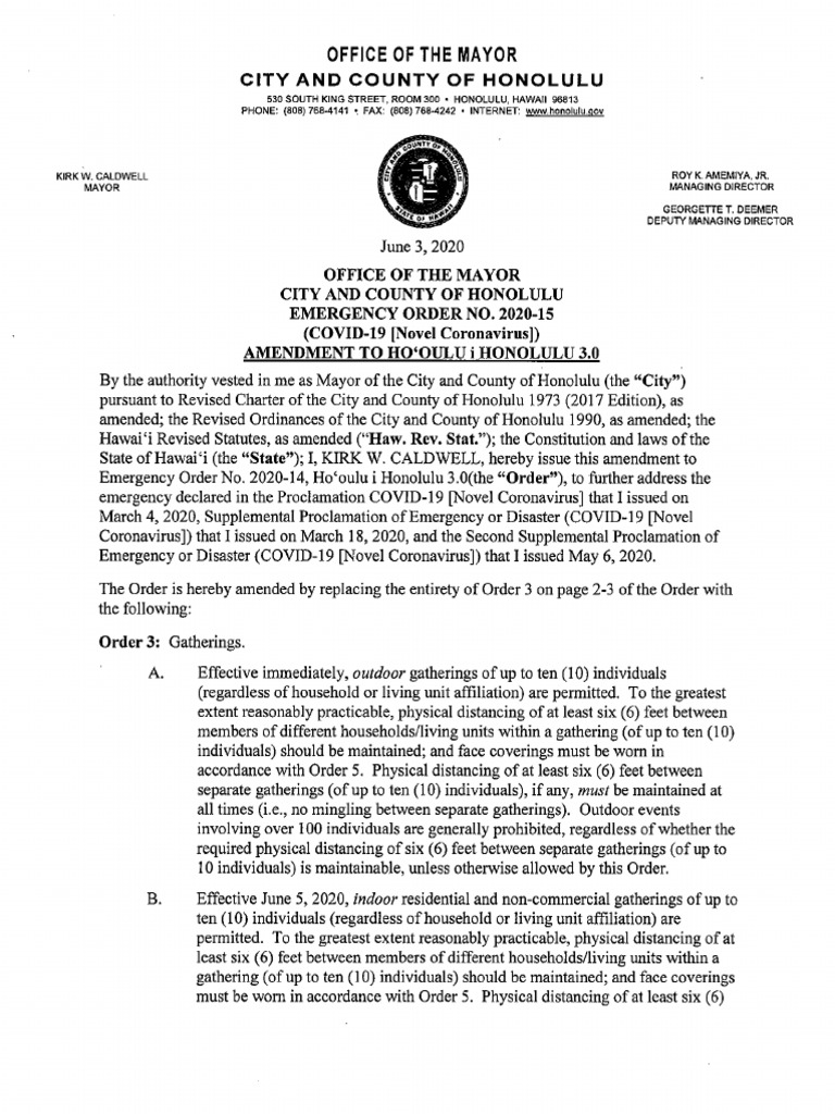 Honolulu Emergency Order 2020-15 Update