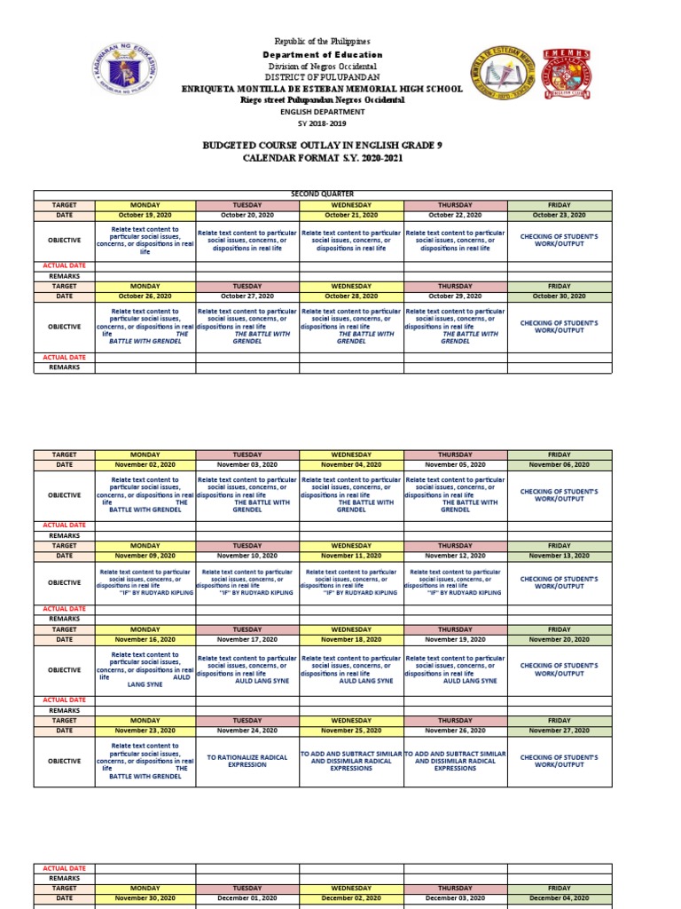 BUDGETED COURSE OUTLAY IN ENGLISH GRADE 9