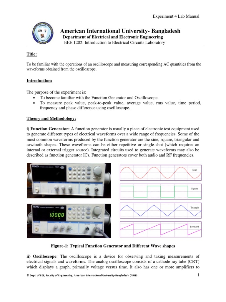 • To become familiar with the Function Generator and Oscilloscope.