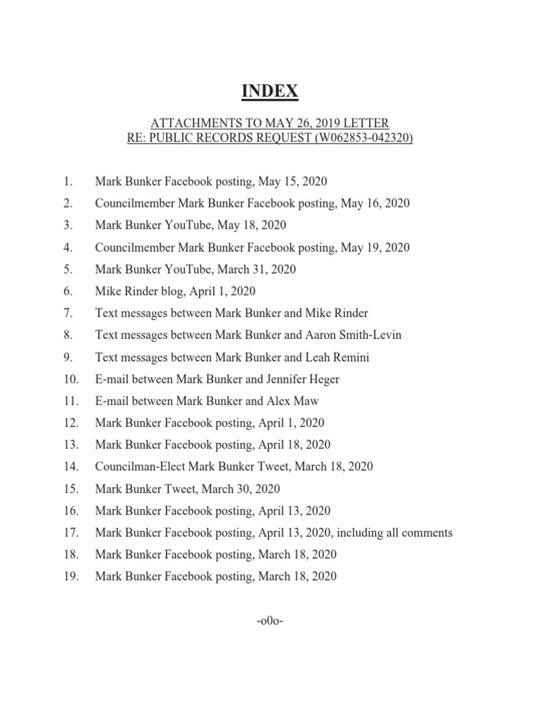 ATTACHMENTS TO MAY 26, 2019 LETTER RE: PUBLIC RECORDS REQUEST (W062853-042320) 1.Mark Bunker Facebook posting, May 15, 2020 2.Councilmember Mark Bunker Facebook posting, May 16, 2020 3.Mark Bunker YouTube, May 18, 2020 4.Councilmember Mark Bunker Facebook posting, May 19, 2020 5.Mark Bunker YouTube, March 31, 2020 6.Mike Rinder blog, April 1, 2020 7.Text messages between Mark Bunker and Mike Rinder 8.Text messages between Mark Bunker and Aaron Smith-Levin 9.Text messages between Mark Bunker and Leah Remini 10.E-mail between Mark Bunker and Jennifer Heger 11.E-mail between Mark Bunker and Alex Maw 12.Mark Bunker Facebook posting, April 1, 2020 13.Mark Bunker Facebook posting, April 18, 2020 14.Councilman-Elect Mark Bunker Tweet, March 18, 2020 15.Mark Bunker Tweet, March 30, 2020 16.Mark Bunker Facebook posting, April 13, 2020 17.Mark Bunker Facebook posting, April 13, 2020, including all comments 18.Mark Bunker Facebook posting, March 18, 2020 19.Mark Bunker Facebook posting, March 18, 2020 -o0o-