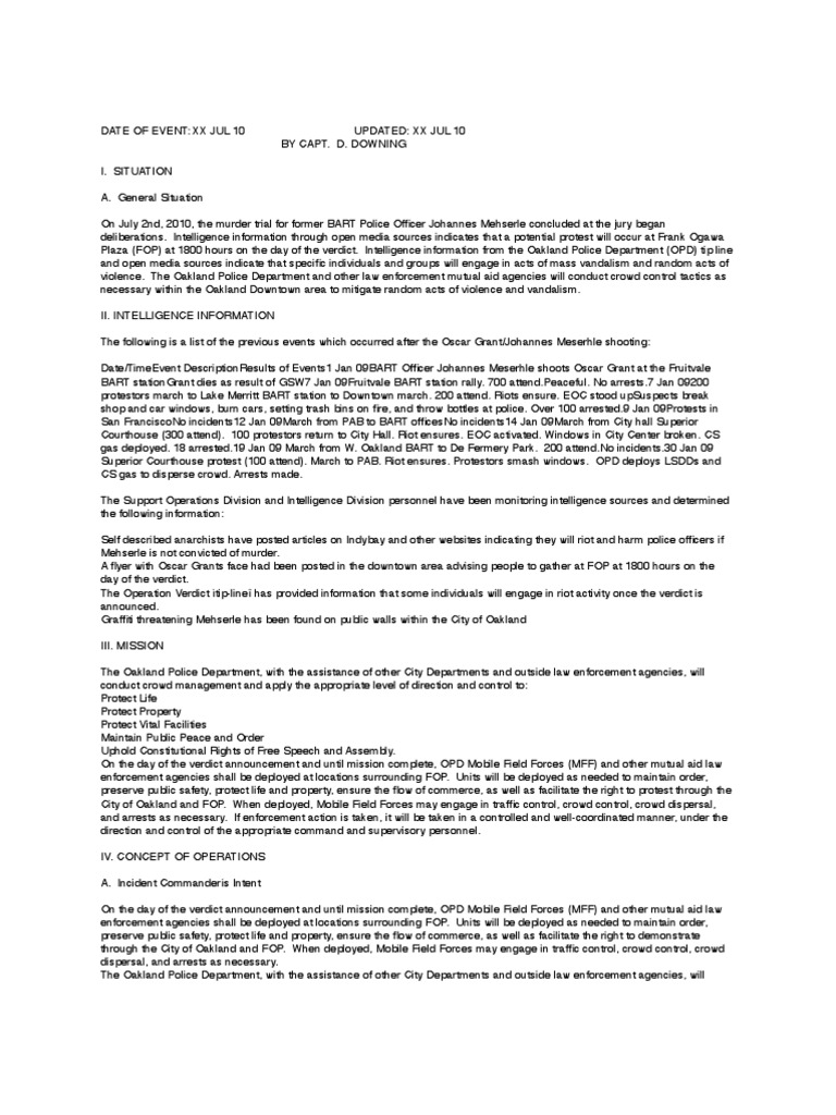 Plaza (FOP) at 1800 hours on the day of the verdict. Intelligence information from the Oakland Police Department (OPD) tip line
