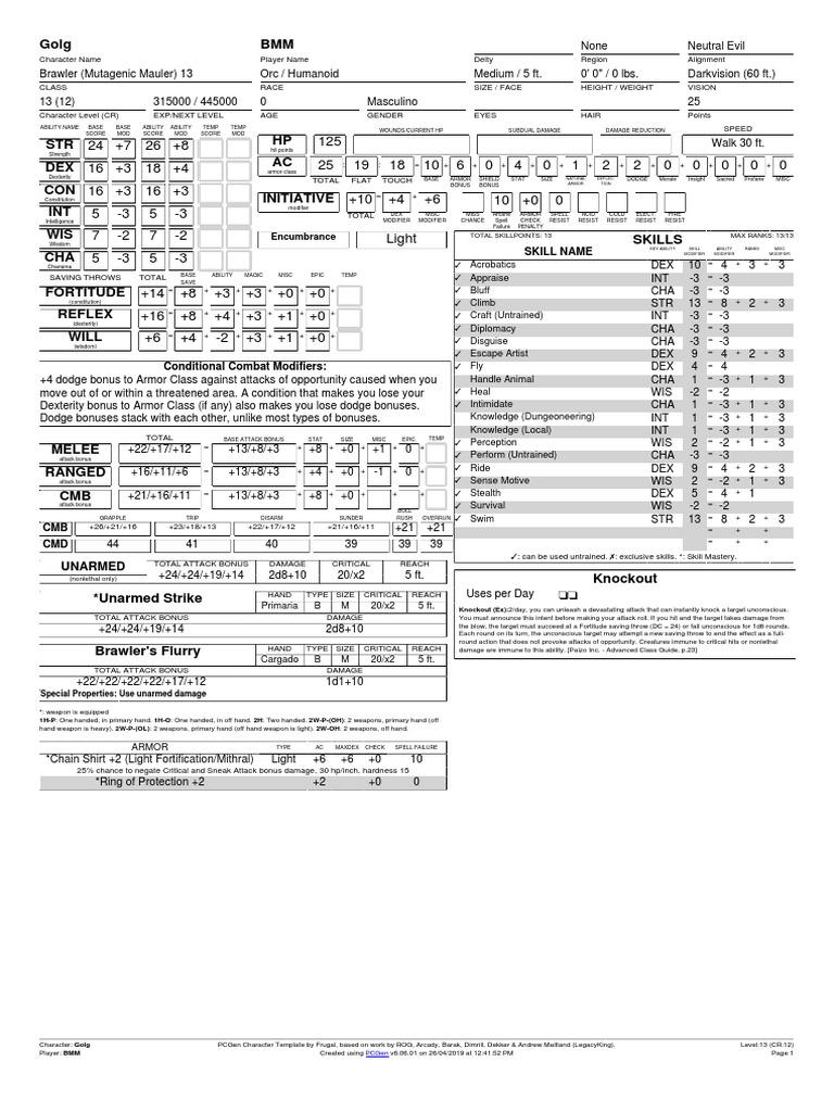 Character: Golg PCGen Character Template by Frugal, based on work by ROG, Arcady, Barak, Dimrill, Dekker & Andrew Maitland (LegacyKing). Level:13 (CR:12)