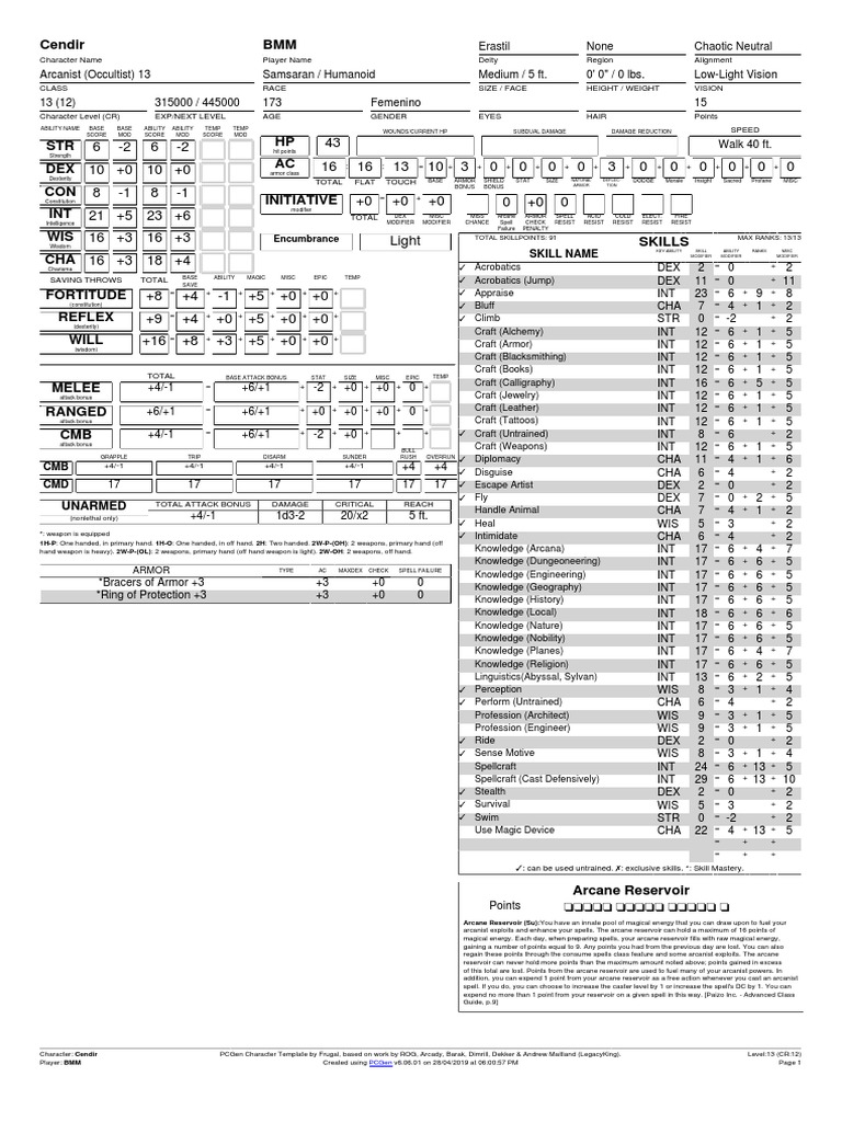 Character: Cendir PCGen Character Template by Frugal, based on work by ROG, Arcady, Barak, Dimrill, Dekker & Andrew Maitland (LegacyKing). Level:13 (CR:12)
