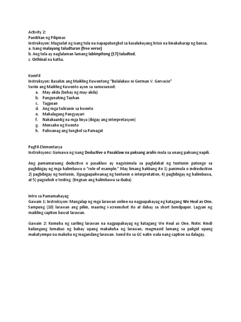 Instruksyon: Magsulat ng isang tula na napapatungkol sa kasalukuyang krisis na kinakaharap ng bansa.