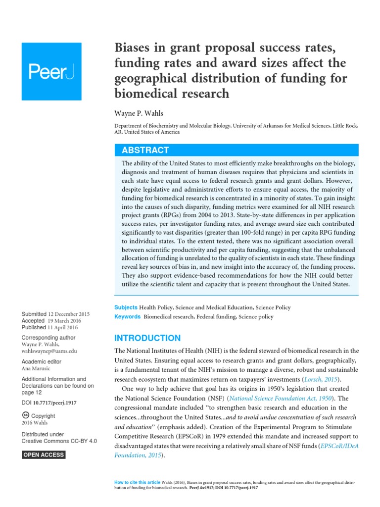 bution of funding for biomedical research. PeerJ 4:e1917; DOI 10.7717/peerj.1917