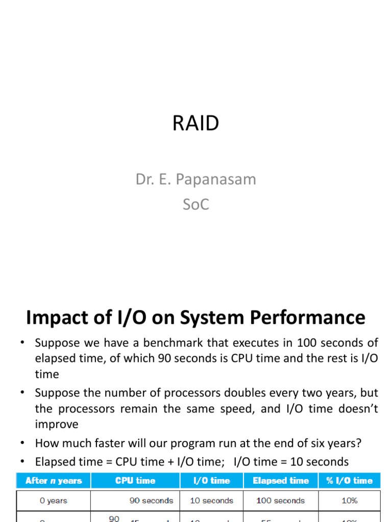 • Elapsed time = CPU time + I/O time; I/O time = 10 seconds