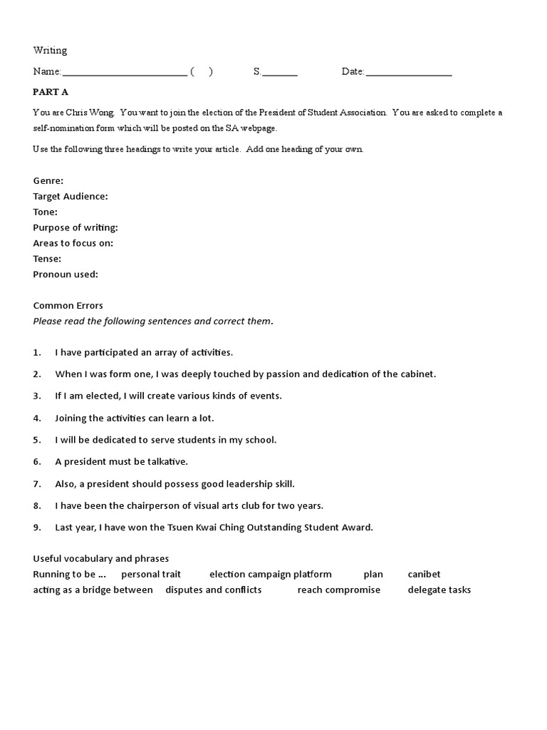 You are Chris Wong. You want to join the election of the President of Student Association. You are asked to complete a