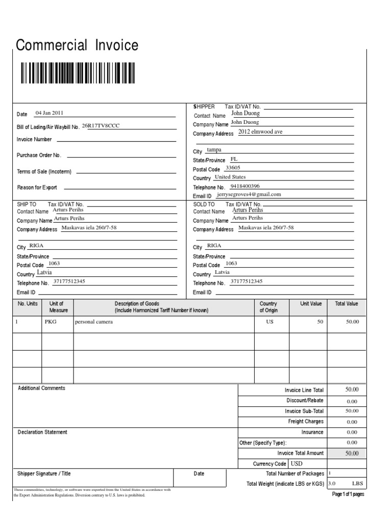 Bill of Lading/Air Waybill No. 26R17TV8CCC Company Name John Duong