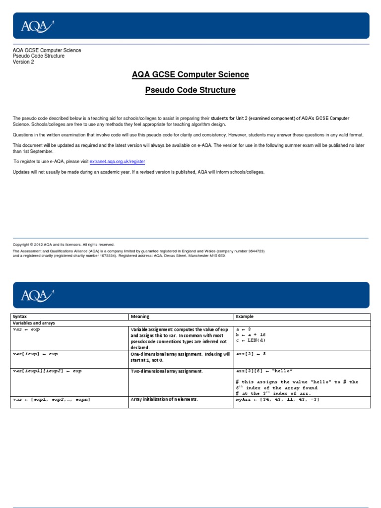 The pseudo code described below is a teaching aid for schools/colleges to assist in preparing their students for Unit 2 (examined component) of AQA’s GCSE Computer
