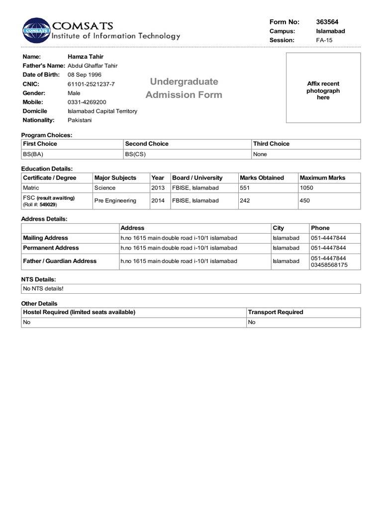 5.Attach paid NTS Challan of Rs.700 [if you want to appear for NTS test in CIIT-Islamabad Campus].