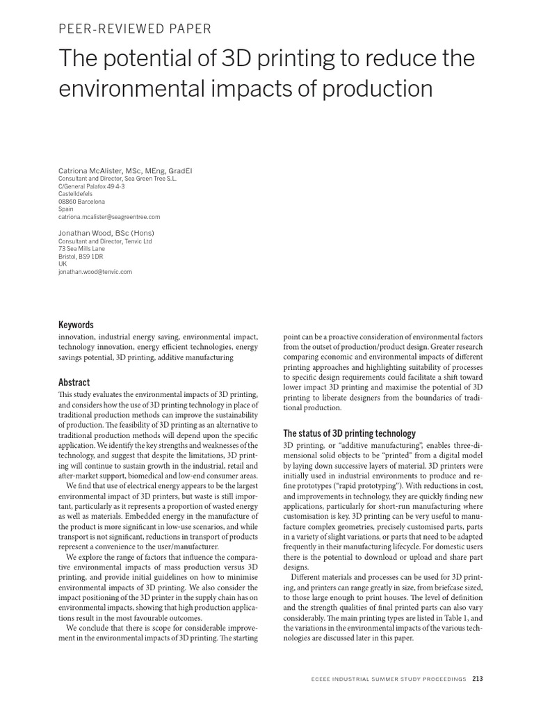 ment in the environmental impacts of 3D printing. The starting nologies are discussed later in this paper.